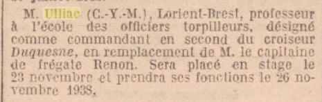 Commandant en second du croiseur "DUQUESNE" le 26 novembre 1938