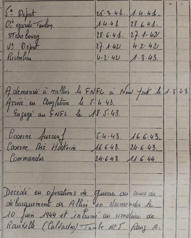 Le 5 mai 1943 il arrive en Angleterre et rallie la "Caserne Surcouf",
