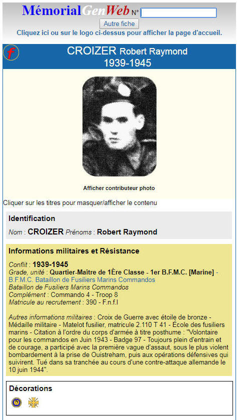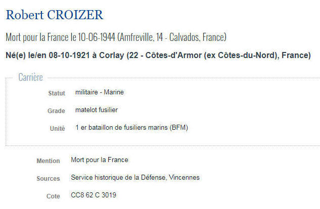 d'armée, à titre posthume le matelot Robert CROIZER .