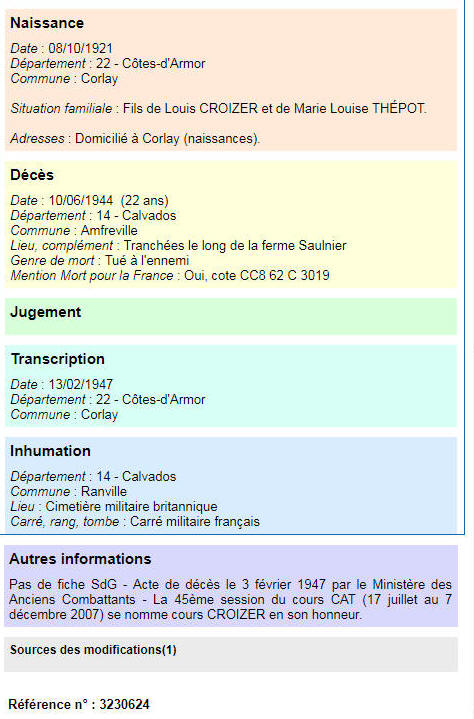Décédé le 10 juin 1944 à AMFREVILLE (Calvados)