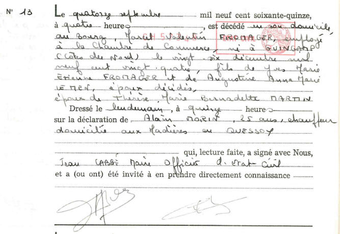 Acte de décès transmis par la mairie de Quessoy (Côtes d'Armor)