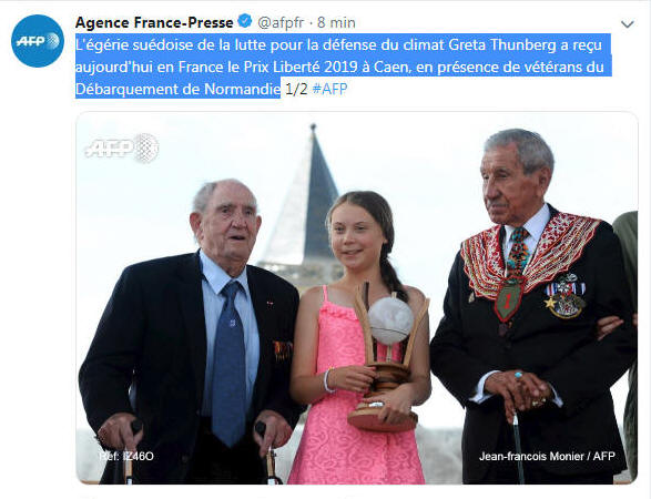 Thunberg a reçu aujourd'hui en France le Prix Liberté 2019 à Caen, en