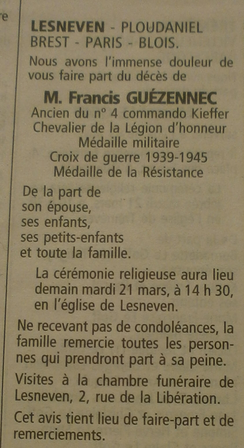 Décédé le 18 mars 2006 à LESNEVEN (Finistère)