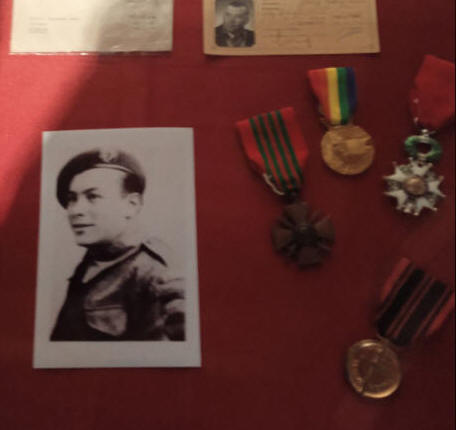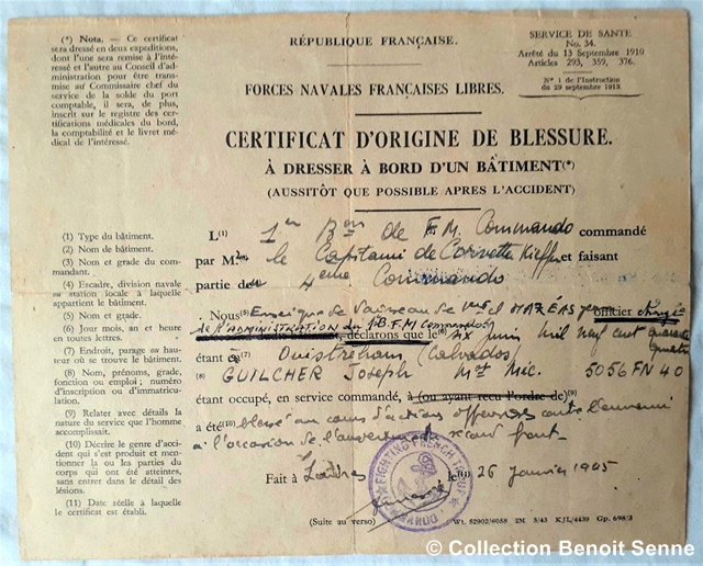 sur la plage le 6 juin 1944 par des éclats à la cheville et dans le dos,