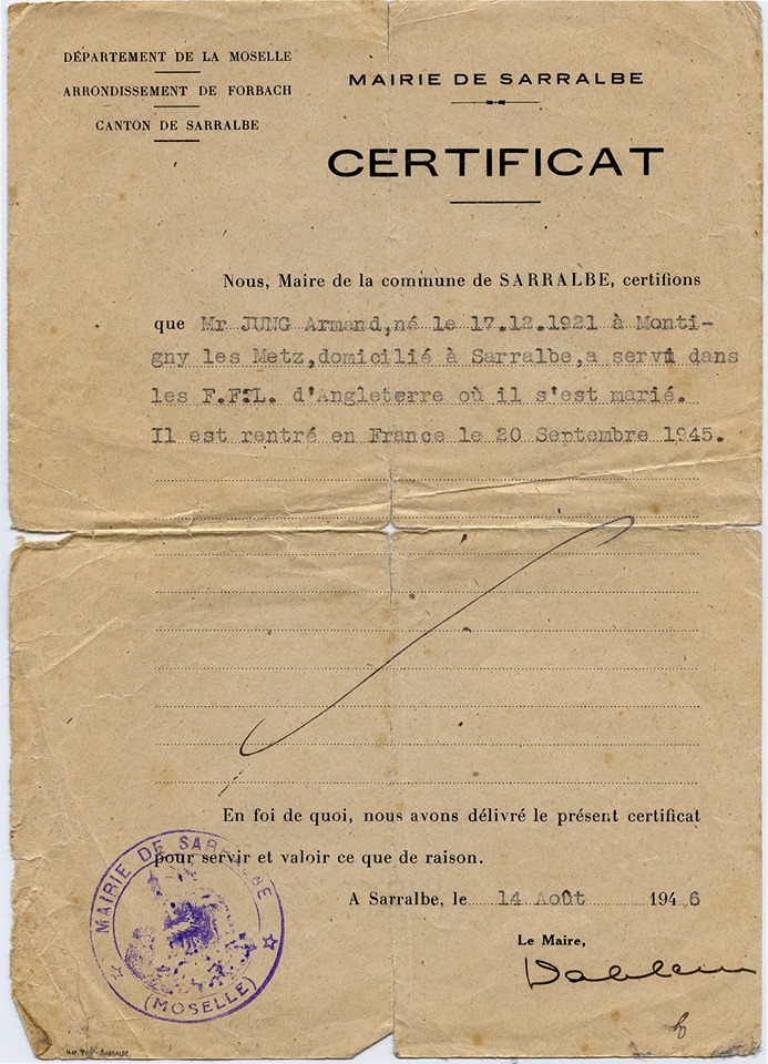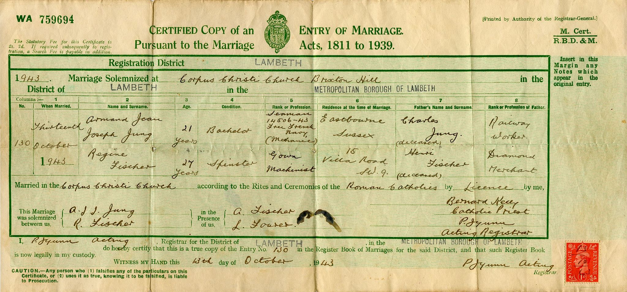 Armand Jung s'était marié à Londres le 13octobre 1943 avec Régine