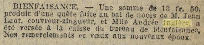 Andrée Louise INGLERE, née le 10 décembre 1905 à SILLERY (Marne) et décédée