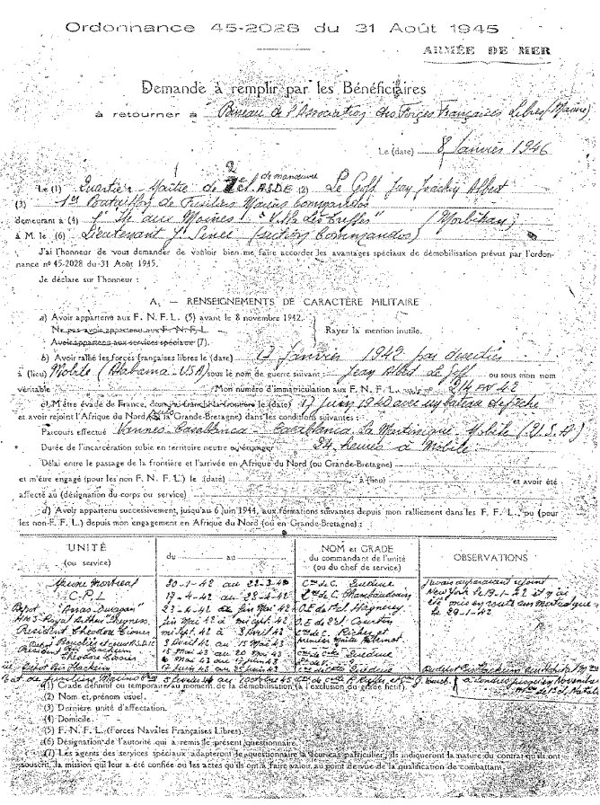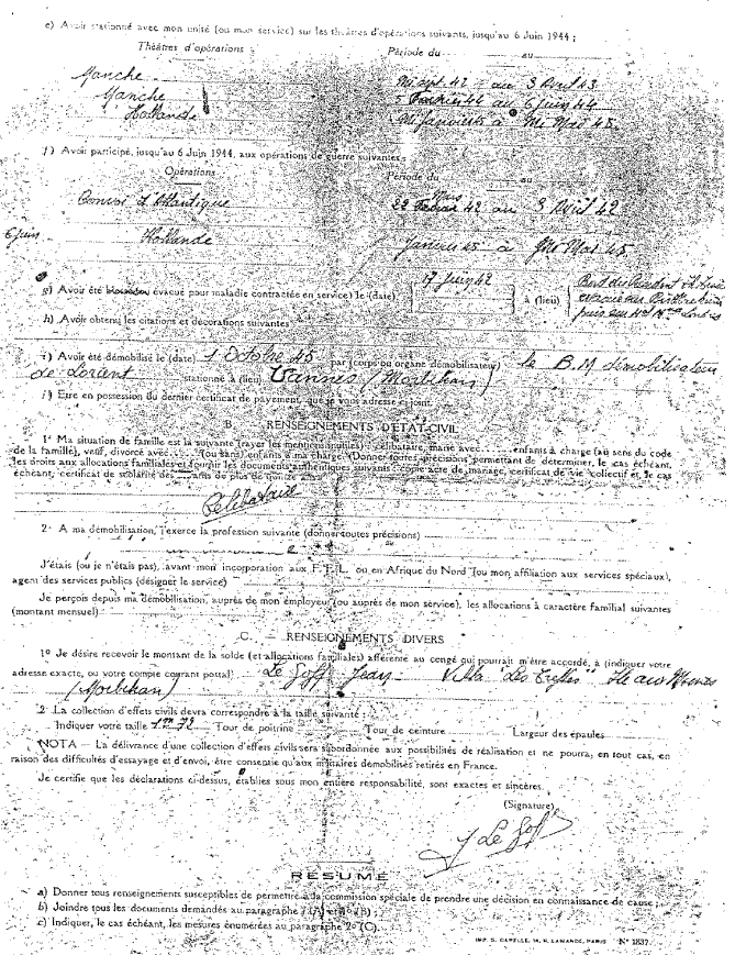 Démobilisé le 1er octobre 1945 à Vannes par le bureau militaire