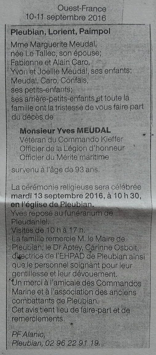 commune de PLEUBIAN (Côtes d'Armor) - Décédé le 9 septembre 2016 à