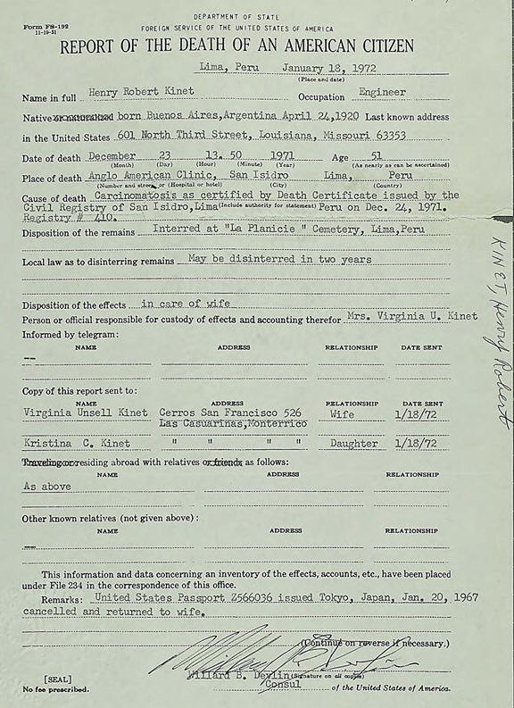 Décédé le 23 décembre 1971 à LIMA au Pérou