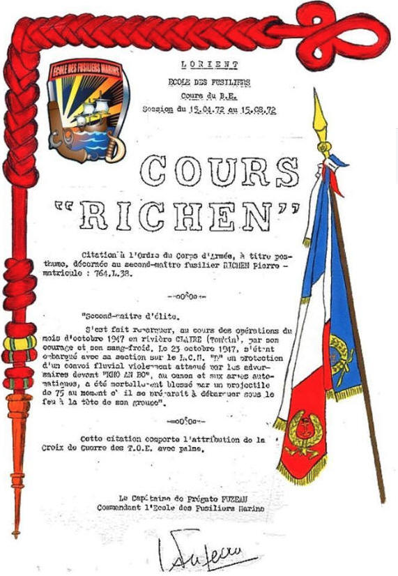 1972, cours RICHEN. Citation à l'ordre du corps d'armée à titre posthume