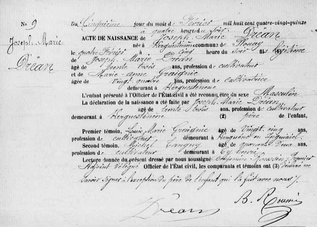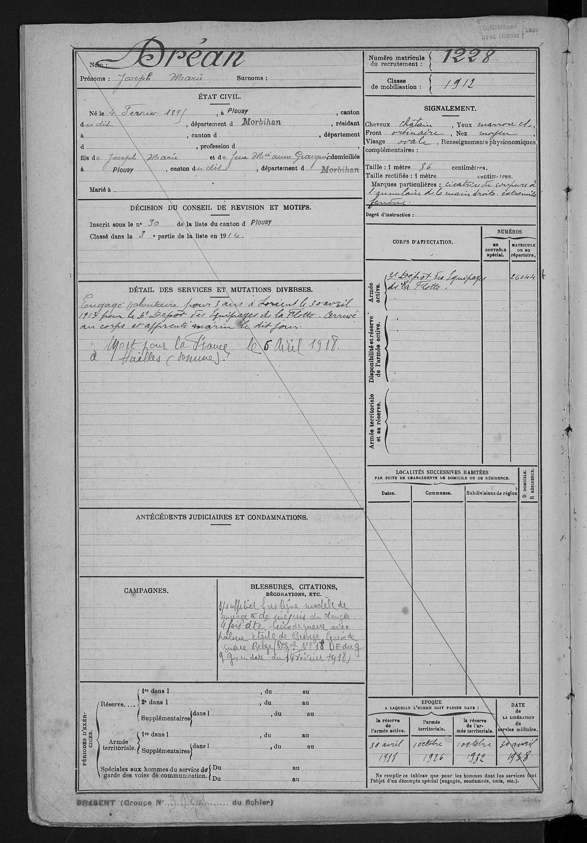 DREAN Joseph Marie, né le 4 février 1895 à PLOUAY (Morbihan), Second