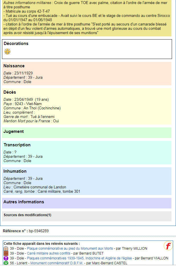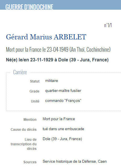 Né le 23 novembre 1929 à DOLE (Jura) - Décédé le 23 avril 1949 à AN