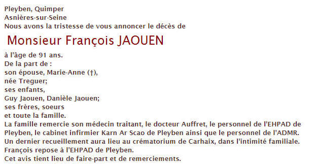 Remerciements Famille Jaouen
