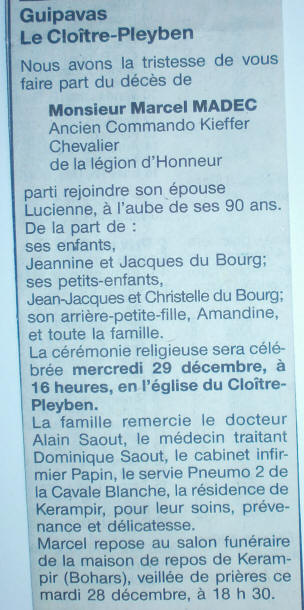Obsèques le 29 décembre 2010 en l'église du Cloitre Pleyben