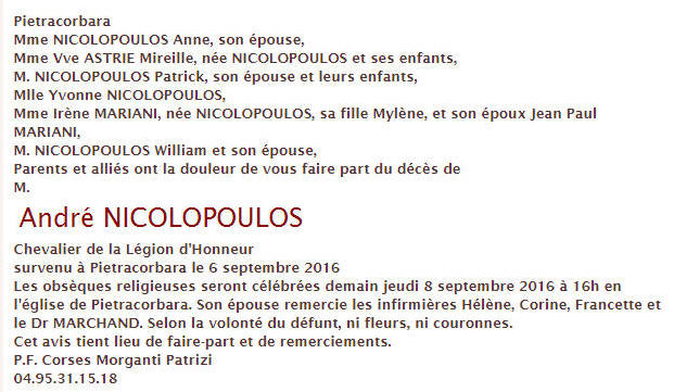 Obsèques le 8 septembre 2016 en l'église de Pietracorbara (Haute Corse)