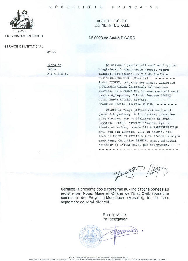 Né le 11 mars 1924 à FREYMING-MERLEBACH (Moselle) - Décédé le 19 janvier