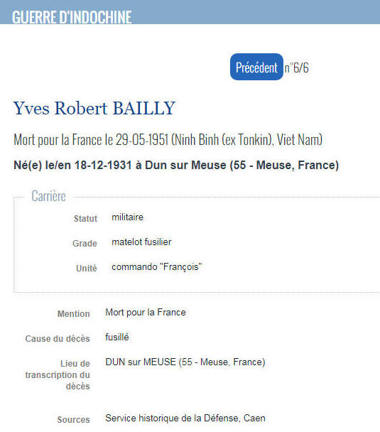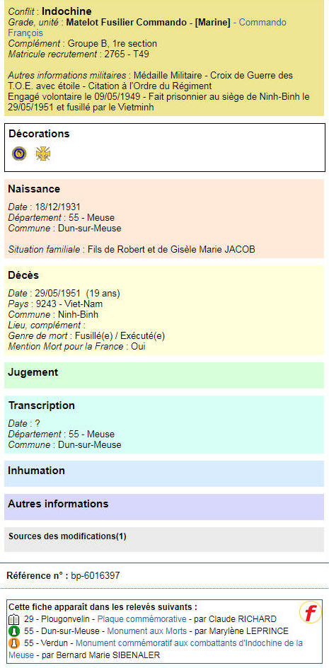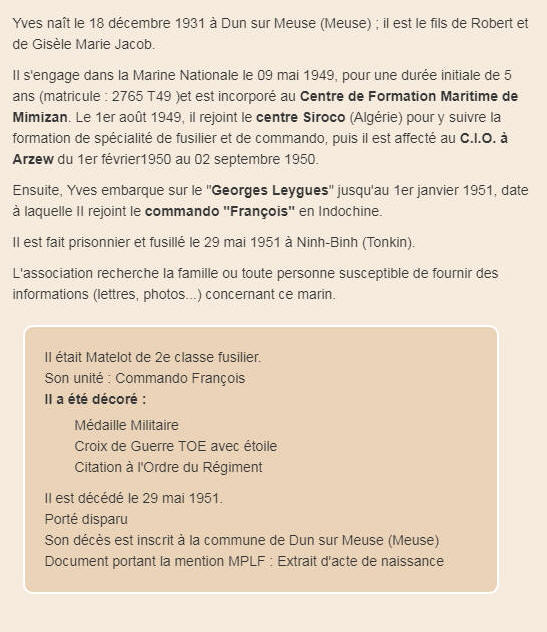 Né le 18 décembre 1931 à DUN sur MEUSE (Meuse) - Décédé le 29 mai 1951 à NINH BINH (Vietnam)