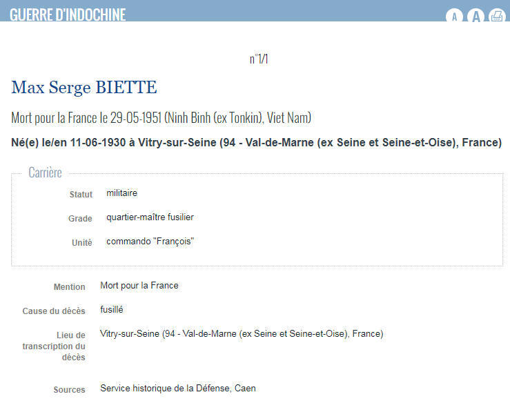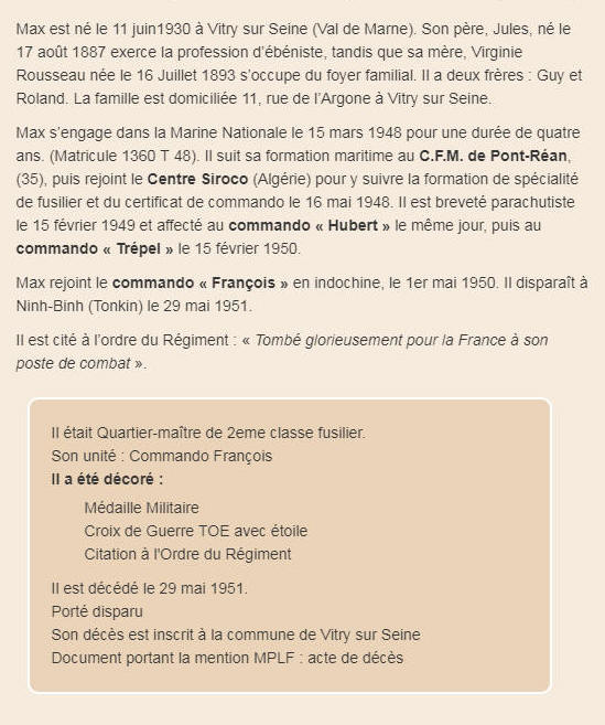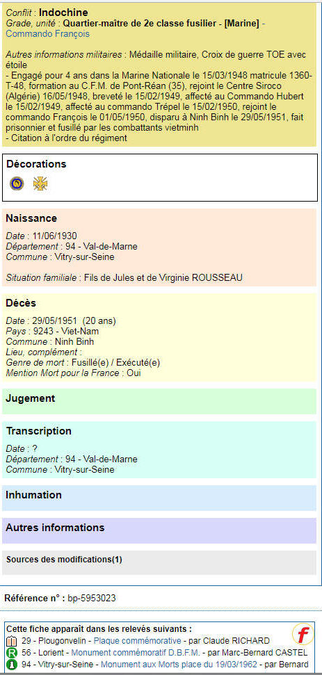 Né le 11 juin 1930 à VITRY sur SEINE (Val de Marne) - Décédé le 29 mai 1951 à NINH BINH (Vietnam)