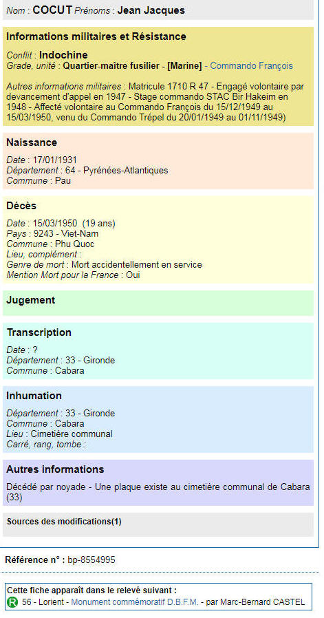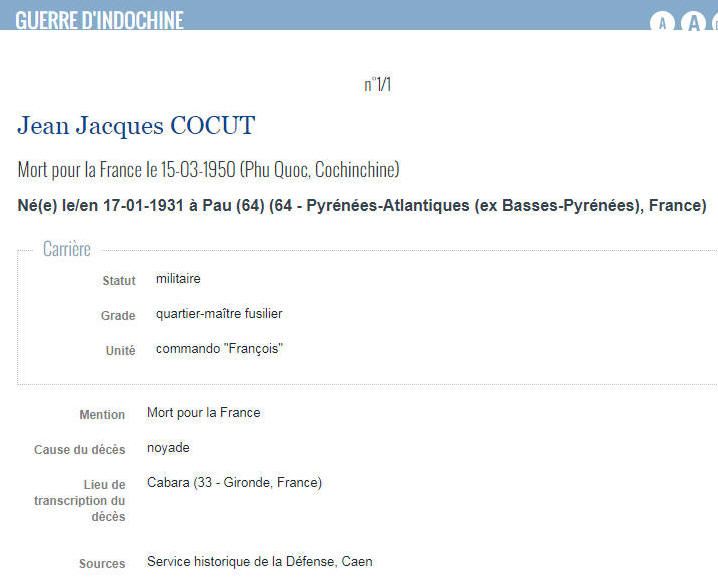 Né le 17 janvier 1931 à PAU (Pyrénées Atlantiques) - Décédé le 15 mars 1950 à PHU QUOC (Cochinchine)