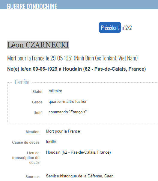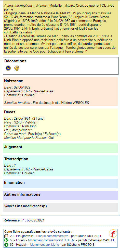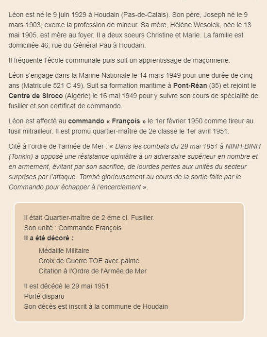 Né le 9 juin 1929 à HOUDAIN (Pas de Calais) - Décédé le 29 mai 1951 à NINH BINH (Vietnam)