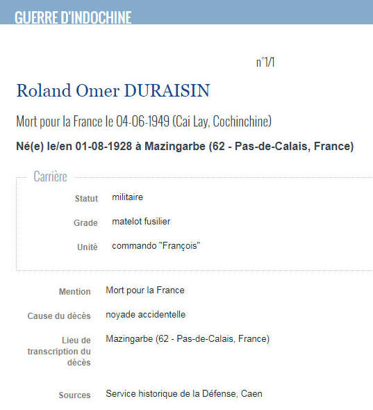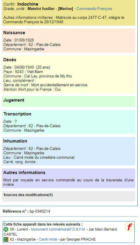 Né le 1er août 1928 à MAZINGARBE (Pas de Calais) - Décédé le 4 juin 1949 à CAI LAY (Cochinchine)
