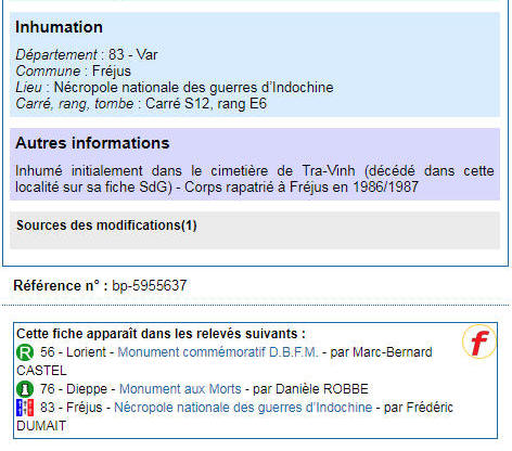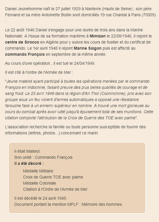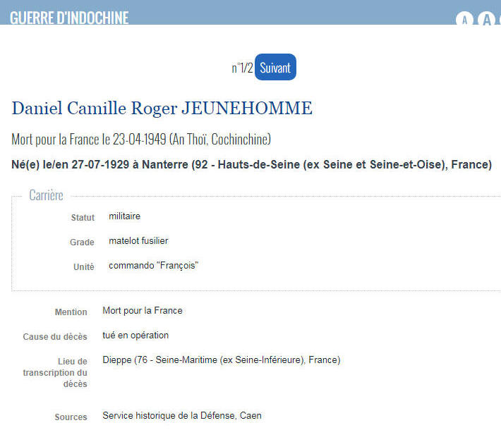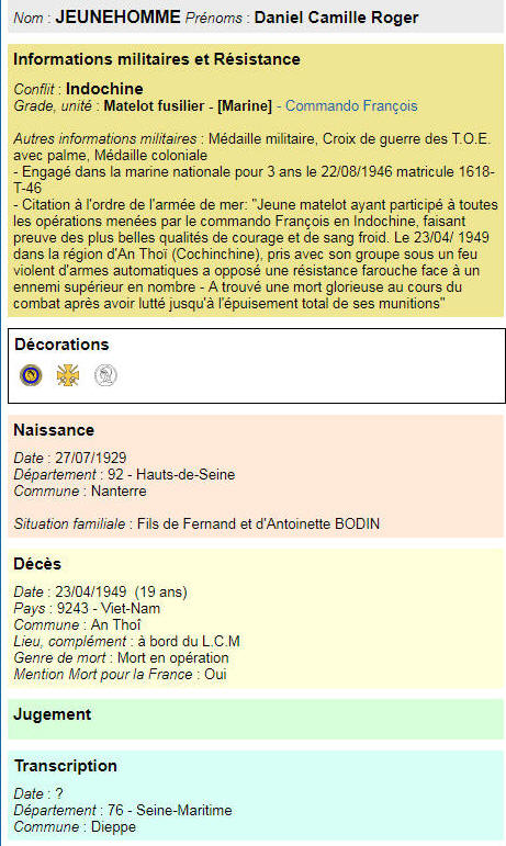 Né le 27 juillet 1929 à NANTERRE (Hauts de Seine) - Décédé le 23 avril 1949 à AN THOÏ (Cochinchine)