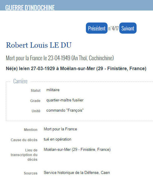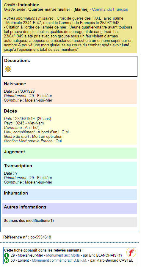 Né le 27 mars 1929 à MOËLAN sur MER (Finistère) / Décédé le 23 avril 1949 à AN THOÏ (Cochinchine)