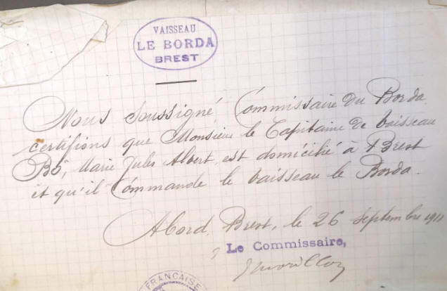 15 septembre 1911, Commandant le "BORDA", École navale en rade de