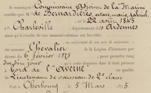Chevalier de la Légion d'Honneur, le 6 février 1875, étant à bord de