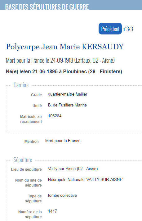 Inhumé au cimetière français de Vailly sur Aisne, sépulture n° 1447