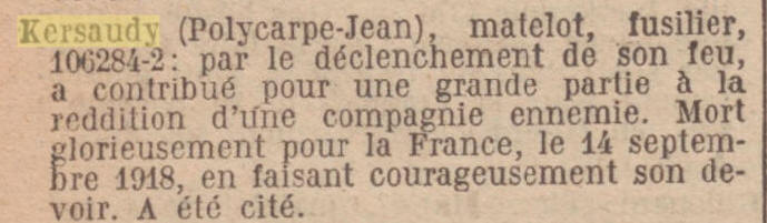 Cité à l'ordre du Bataillon de fusiliers-marins du 25/08/1917 :