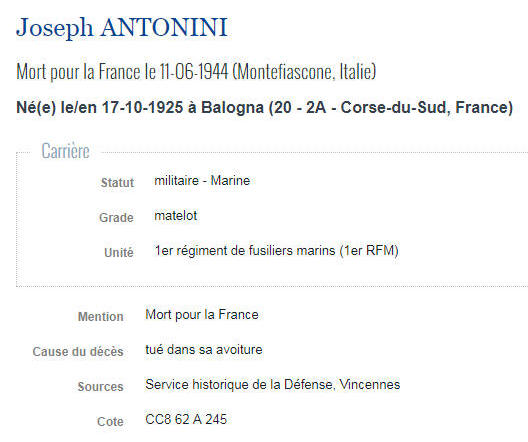 Né le 17 octobre 1925 à BALOGNA (Corse du sud) - Décédé le 11 juin