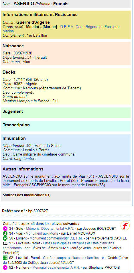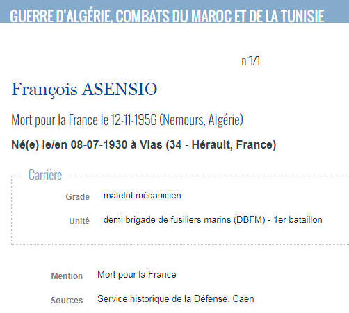 VIAS (Hérault) - Décédé le 12 novembre 1956 à NEMOURS (Algérie)