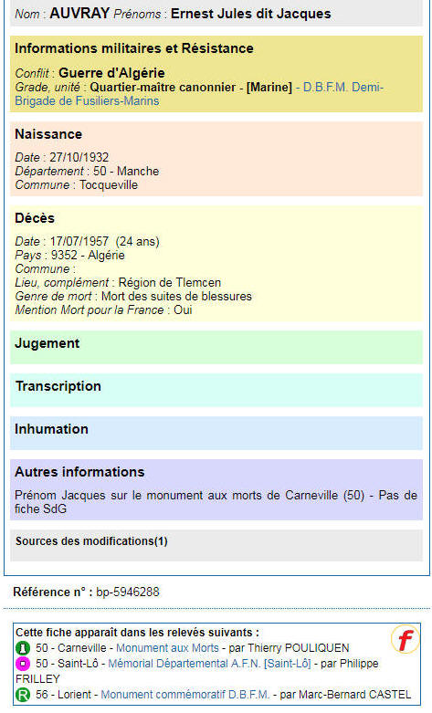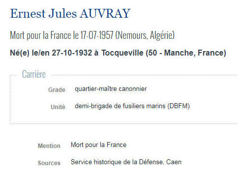 TOCQUEVILLE (Manche) - Décédé le 17 juillet 1957 à NEMOURS (Algérie)