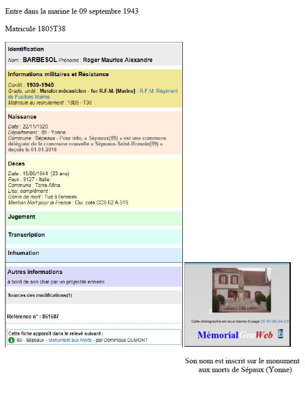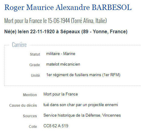 Né le 22 novembre 1920 à SEPEAUX (Yonne) - Décédé le 15 juin 1944 à