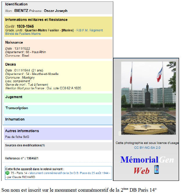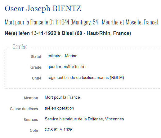 veut que BIENTZ Oscar est mort pour la France et que son frère
