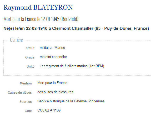 Dôme) - Décédé le 12 janvier 1945 à BERTFELD (Vosges)