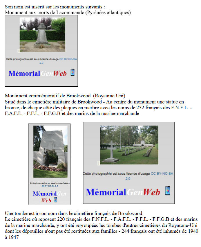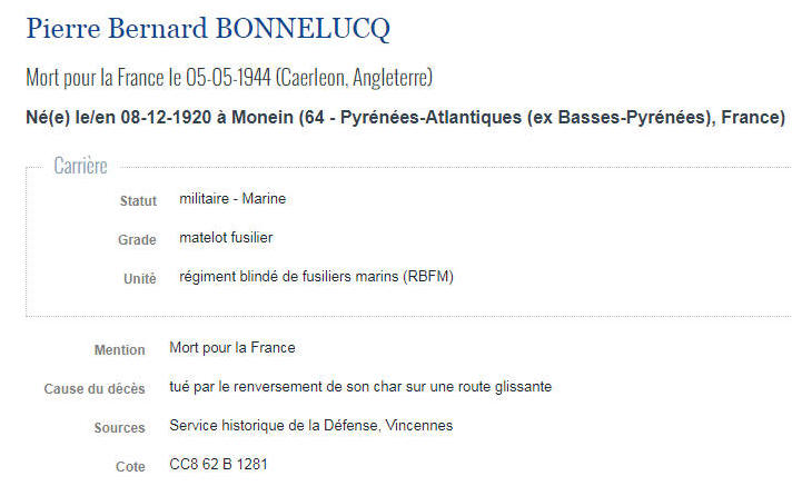 MONEIN (Pyrénées Atlantiques) - Décédé le 5 mai 1944 à CAERLEON (Angleterre)