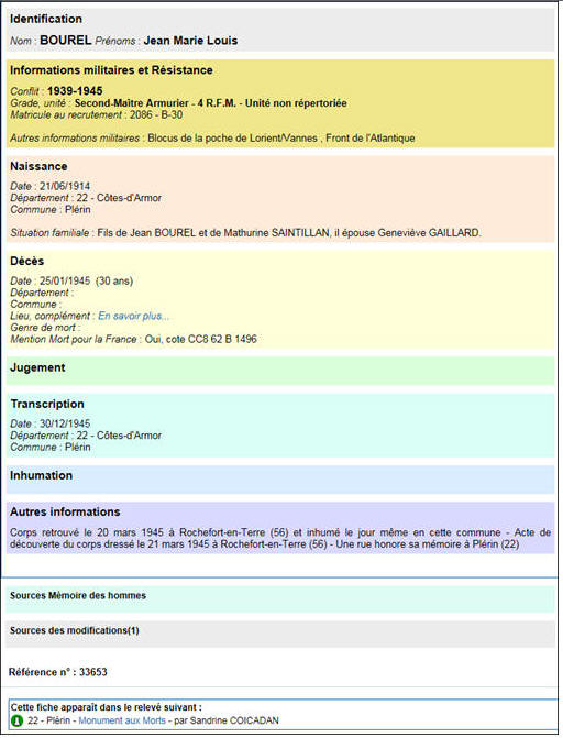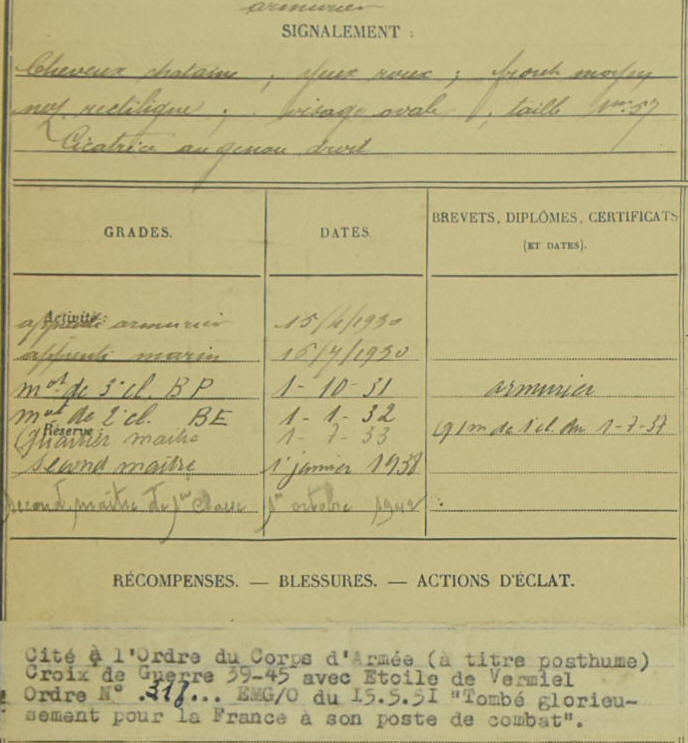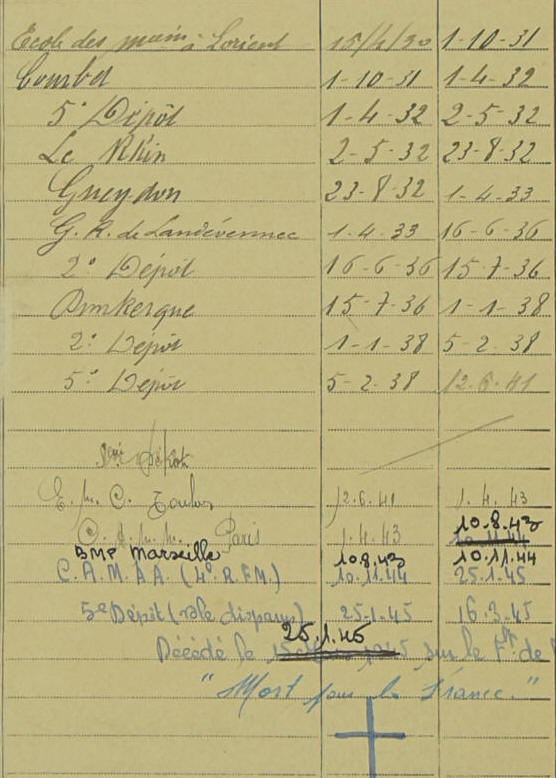 Corps retrouvé le 20 mars 1945 à Rochefort-en-Terre (56) et inhumé