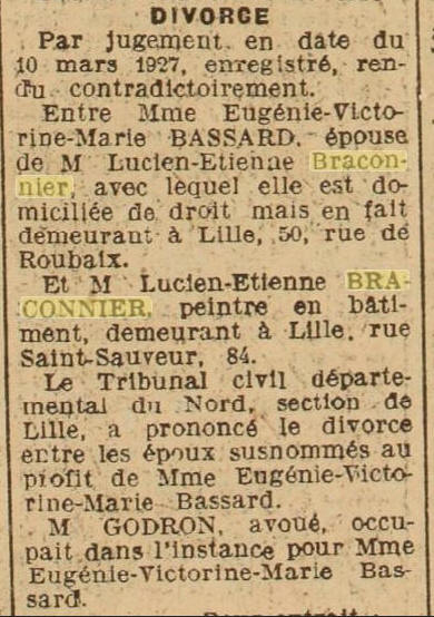 1984 à ARMENTIERES (Nord). Divorce le 10 mars 1927