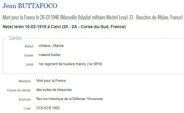 Né le 10 février 1919 à CALVI (Corse du sud) - Décédé le 26 janvier