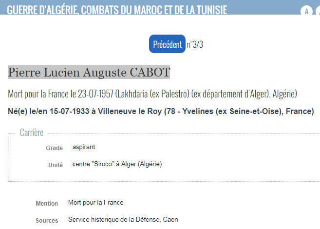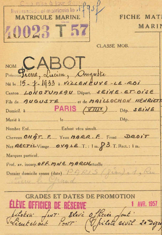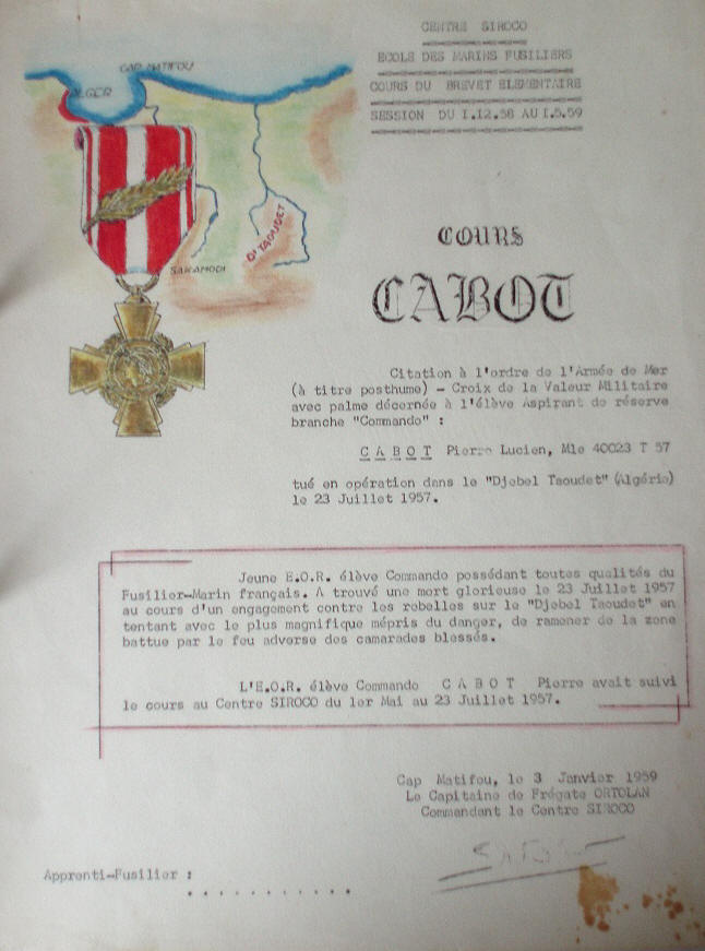 octobre 1957, l'aspirant Cabot a reçu la citation suivante à l'ordre