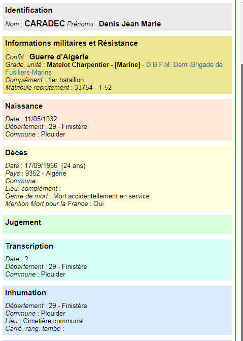 Mentionné au mémorial AFN du Finistère, à Pleyben