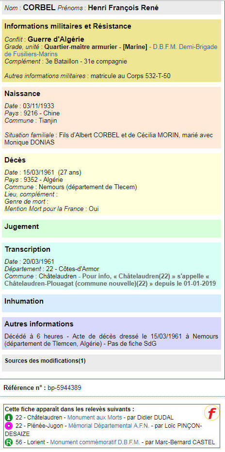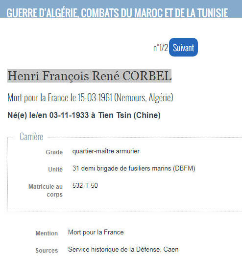 TIEN TSIN (Chine) - Décédé le 15 mars 1961 à NEMOURS (Algérie)