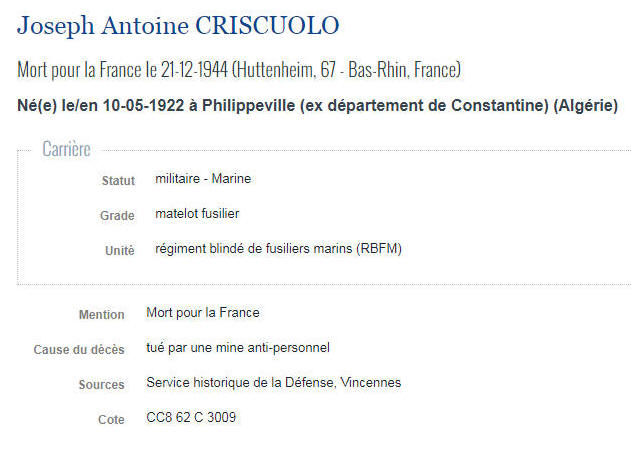 PHILIPPEVILLE (Algérie) - Décédé le 21 décembre 1944 à HUTTENHEIM