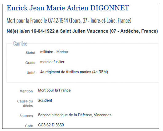 SAINT JULIEN VOCANCE (Ardèche) - Décédé le 07 décembre 1944 à TOURS
