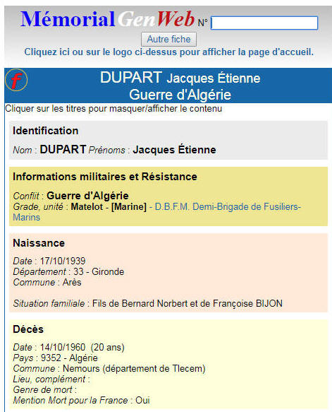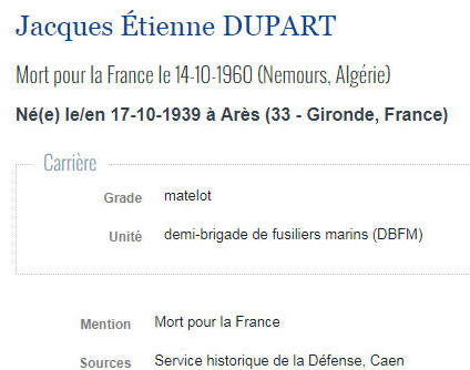 ARES (Gironde) - Décédé le 14 octobre 1960 à NEMOURS (Algérie)