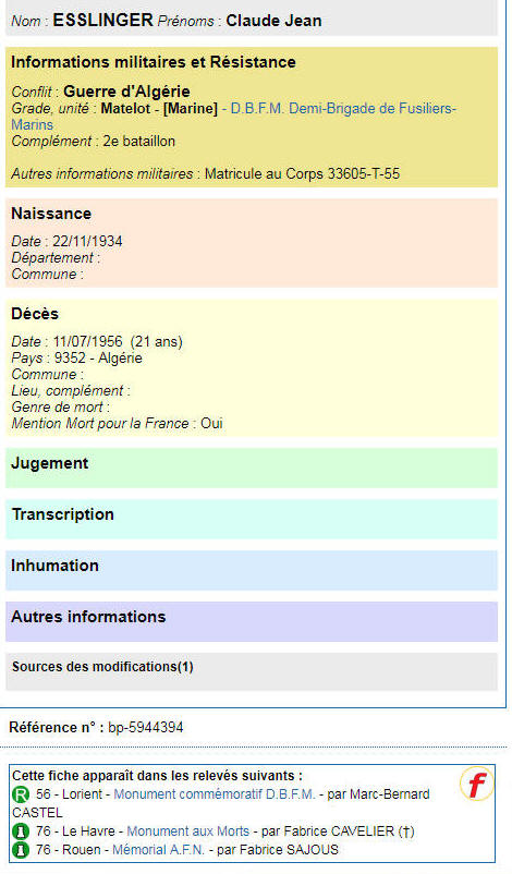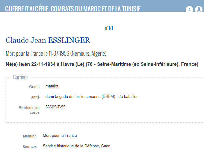 au HAVRE (Seine Maritime) - Décédé le 11 juillet 1956 à NEMOURS (Algérie)