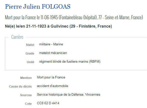 à LE GUILVINEC (Finistère) - Décédé le 11 juin 1945 à FONTAINEBLEAU