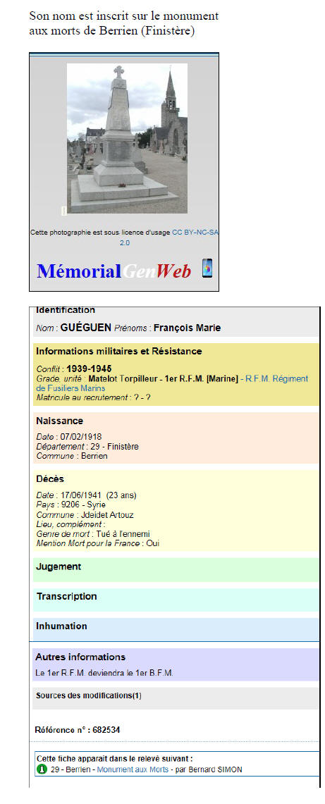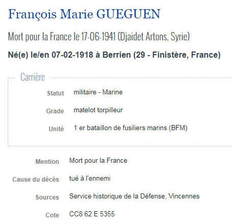 Né le 7 février 1918 à BERRIEN (Finistère) - Décédé le